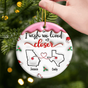 Celebrate your unbreakable bond with this “I Wish We Lived Closer” personalized ceramic ornament. Perfect for best friends, sisters, or couples separated by distance, this custom ornament features state outlines connected by a heart, symbolizing love that knows no miles. Add your names and states to create a meaningful Christmas or birthday gift that keeps your loved ones close to your heart — no matter how far apart you are.