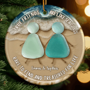 Celebrate the beauty of friendship with this personalized sea glass ornament, featuring two figures made of ocean glass on sandy shores with the quote: “True friends are like sea glass – rare to find and treasured for life.”
